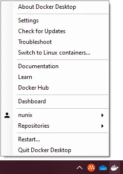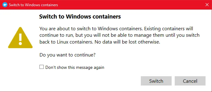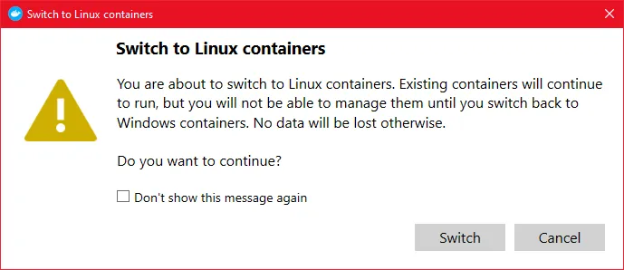 - Once done, switch back to Linux containers, it will be needed for the WSL2 node