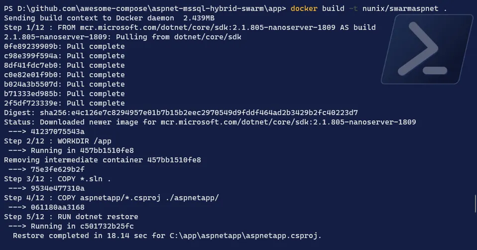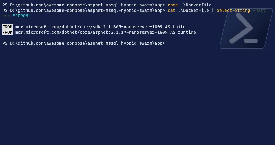 DockerfileTerminal window # Open the Dockerfile in the editor of your choice > I will use VSCodecode Dockerfile# Modify both FROM lines in order to have the Windows image tagsFROM mcr.microsoft.com/dotnet/core/sdk:3.1.201-nanoserver-1909 AS build...FROM mcr.microsoft.com/dotnet/core/aspnet:3.1.3-nanoserver-1909 AS runtime...# Save the file