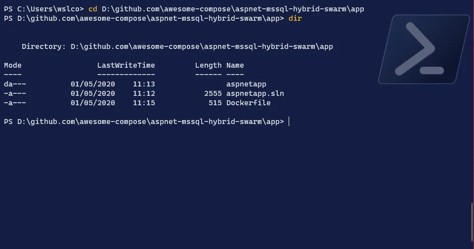 appdirectory which contains theDockerfileTerminal window # Move to the app directory > in the screenshot you will see a copy of aspnet-mssql directorycd <path to Awesome Compose directory>/aspnet-mssql/app# List the content and ensure the Dockerfile is theredir