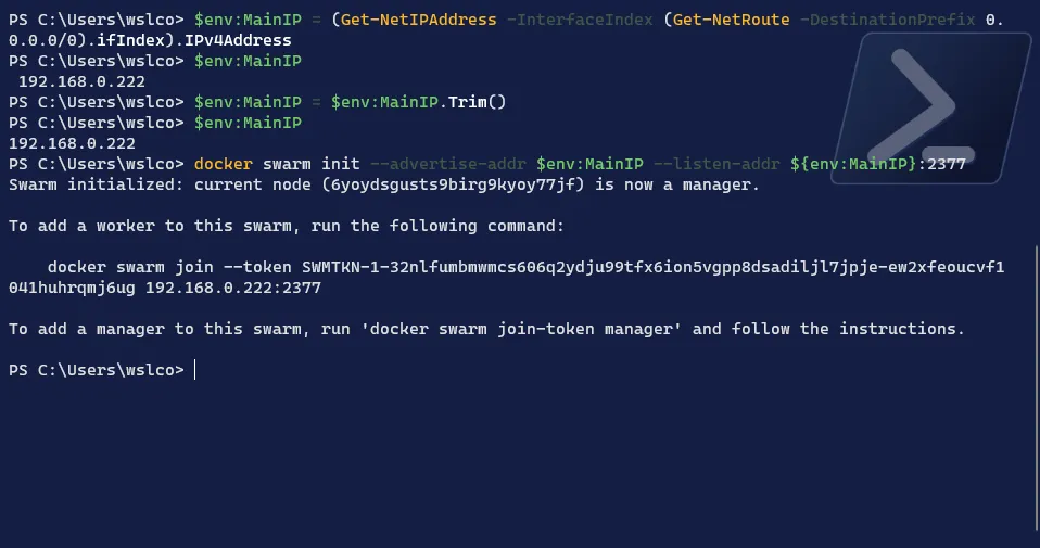 # Get the IP from the "Ethernet" connection$env:MainIP = (Get-NetIPAddress -InterfaceIndex (Get-NetRoute -DestinationPrefix 0.0.0.0/0).ifIndex).IPv4Address# Remove the leading space -> yes, this is tricky$env:MainIP = $env:MainIP.Trim()# Create the swarmdocker swarm init --advertise-addr $env:MainIP --listen-addr ${env:MainIP}:2377