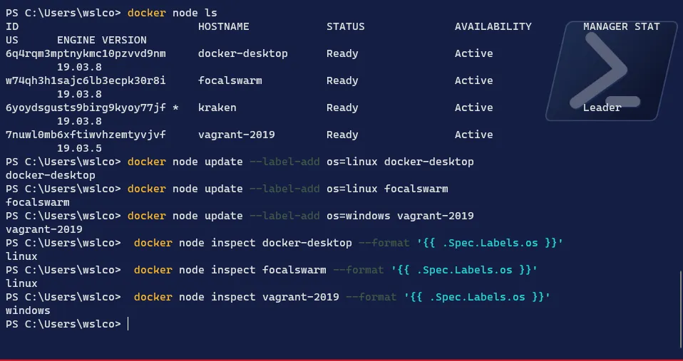 # Get a list of the nodesdocker node ls# From the manager node, add the label to the Linux nodesdocker node update --label-add os=linux <linux worker node 1>docker node update --label-add os=linux <linux worker node 2># From the manager node, add the label to the Windows worker nodedocker node update --label-add os=linux <windows worker node># Check that the label has been correctly set docker node inspect <worker node> --format '{{ .Spec.Labels.os }}'