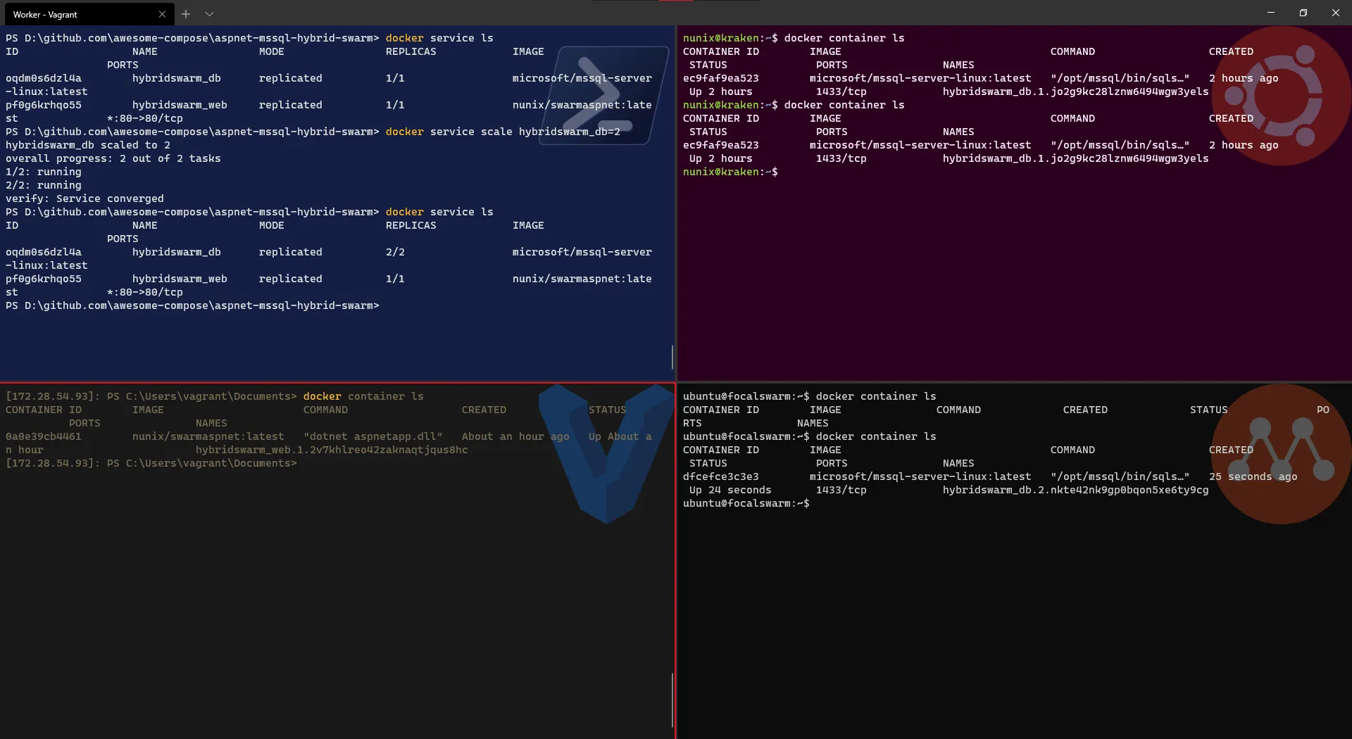 Terminal window # List the servicesdocker service ls# Check on which node the DB service has been created > should be a Linux nodedocker service ps <DB service name># Check on which node the WEB service has been created > should be the Windows nodedocker service ps <WEB service name># [Optional] Check the containers created on worker nodedocker container ls