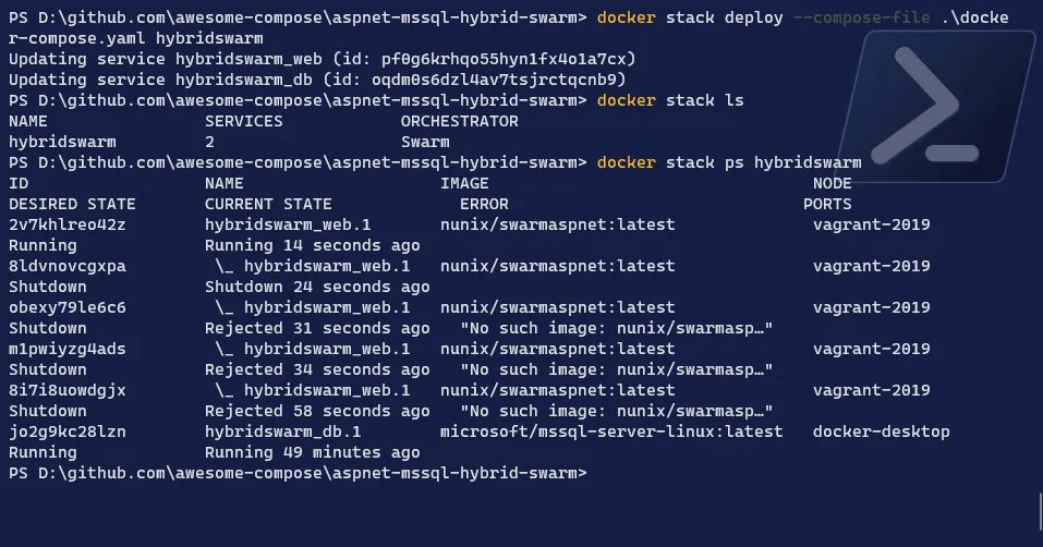 Terminal window # Deploy the application stack > I will name it hybridswarmdocker stack deploy --compose-file docker-compose.yaml <application name># Check if the stack has been correctly deployeddocker stack ls# Check the services created with our deploymentdocker stack ps <application name>