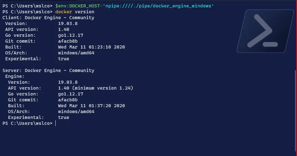 $env:DOCKER_HOSTto the Docker Windows named pipeTerminal window # Sets the variable DOCKER_HOST for the Windows docker client$env:DOCKER_HOST='npipe:////./pipe/docker_engine_windows'