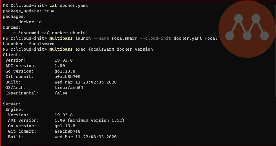 Terminal window # Check content of a cloud-init configuration filecat docker.yaml# Creates the new instance with the cloud-init configuration file and with the focal imagemultipass launch --name <hostname> --cloud-init docker.yaml focal# Check that docker was installed and it's runningmultipass exec <hostname> docker version