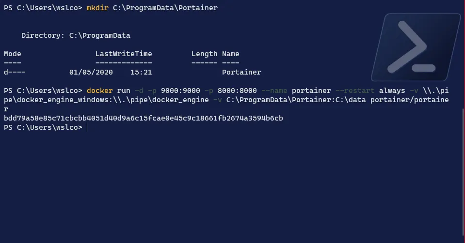 # Create a new Visualizer container on the Manager nodedocker run -d -p 9000:9000 -p 8000:8000 --name portainer --restart always -v \\.\pipe\docker_engine_windows:\\.\pipe\docker_engine -v C:\ProgramData\Portainer:C:\data portainer/portainer