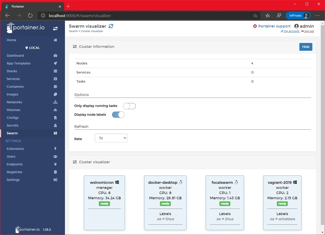 On Portainer, we can click on the link “Go to cluster visualizer” and enable the option “Display node labels”