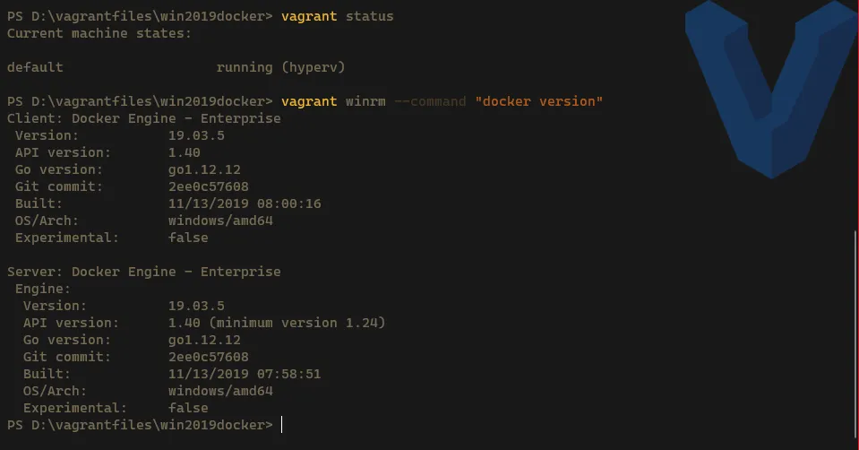 Terminal window # Check the status of the VMvagrant status# Check if Docker is runningvagrant winrm --command "docker version"