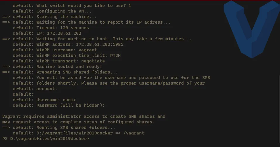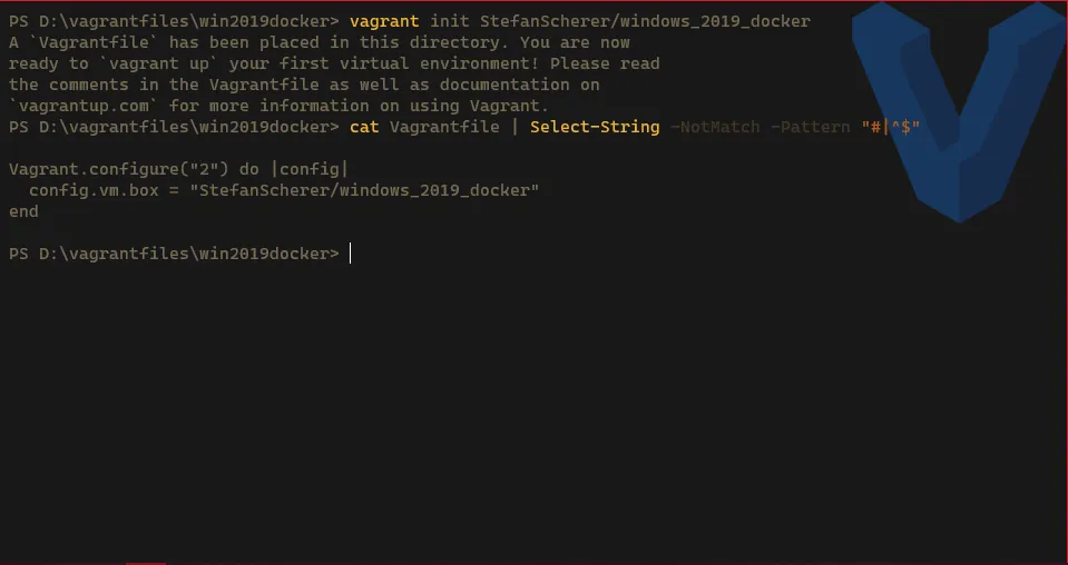 Terminal window # Download the Vagrantfilevagrant init StefanScherer/windows_2019_docker# Check the Vagrantfile > remove the commented and empty linescat Vagrantfile | Select-String -NotMatch -Pattern "#|^$"