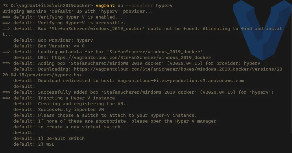 Terminal window # Create the new VM on Hyper-Vvagrant up --provider hyperv
