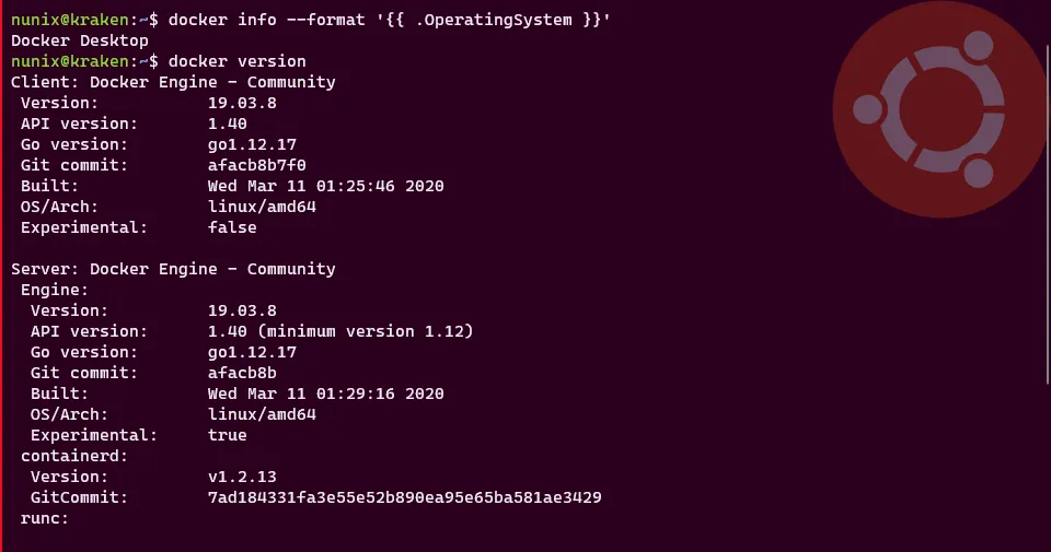 # Verifies which OS is docker running ondocker info --format '{{ .OperatingSystem }}'# Verifies that the client can connect to the enginedocker version