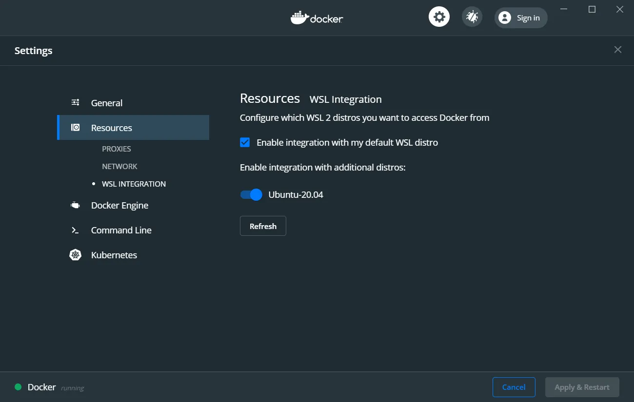 Once done, click on “Apply & Restart” and confirm docker is correctly mounted (bonus: Simon’s WSLConf video to explain it all):