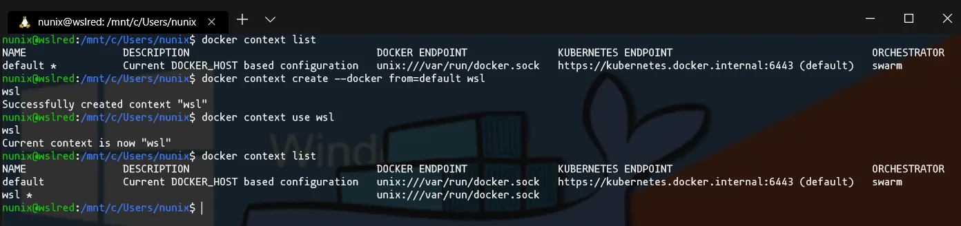 $ docker context list$ docker context create --docker from=default wsl$ docker context use wsl$ docker context list