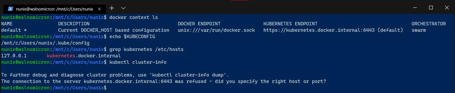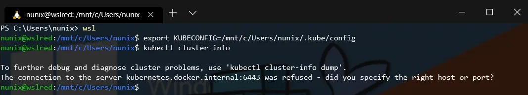 However, from wsl, even if we set the variable KUBECONFIG to the docker kubernetes config file, we will face the following issue: