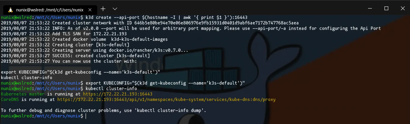 $ k3d create --api-port $(hostname -I | awk '{ print $1 }'):16443$ export KUBECONFIG="$(k3d get-kubeconfig --name='k3s-default')"$ kubectl cluster-info