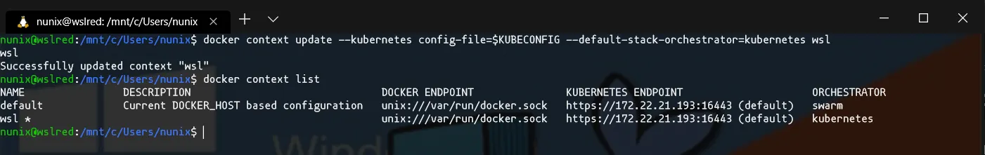 $ docker context update --kubernetes config-file=$KUBECONFIG --default-stack-orchestrator=kubernetes wsl