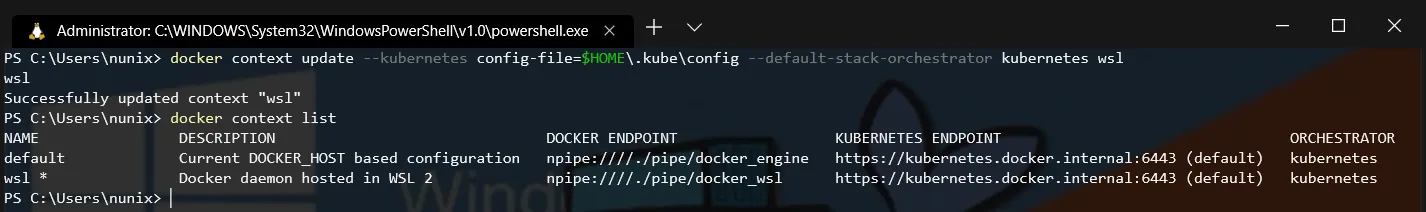 PS> docker context update --kubernetes config-file=$HOME\.kube\config --default-stack-orchestrator kubernetes wsl
