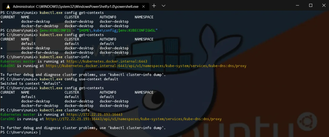 PS> kubectl.exe config get-contextsPS> $env:KUBECONFIG = "$HOME\.kube\config;$env:KUBECONFIGWSL"PS> kubectl.exe config get-contextsPS> kubectl.exe cluster-infoPS> kubectl.exe config use-context defaultPS> kubectl.exe config get-contextsPS> kubectl.exe cluster-info