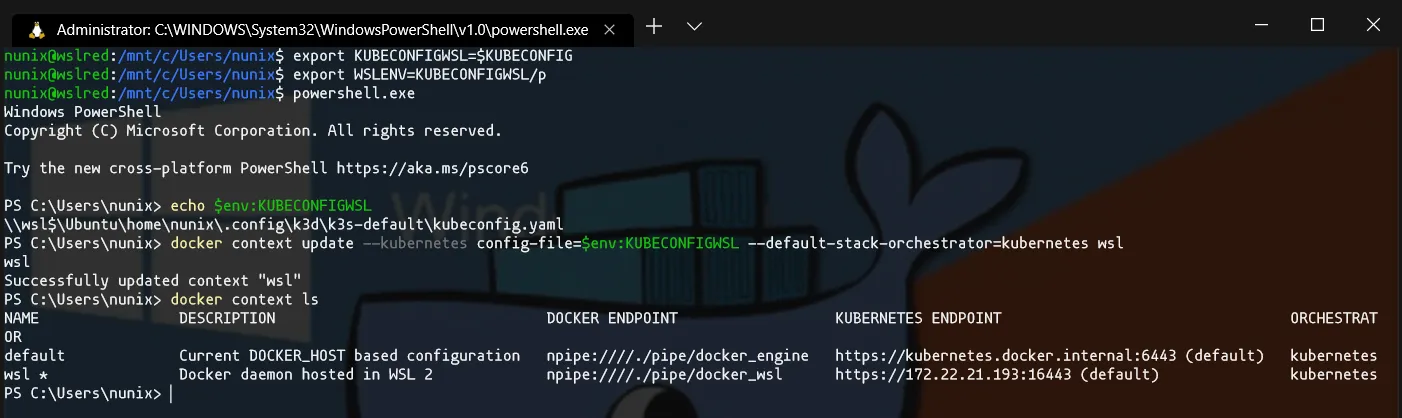 $ export KUBECONFIGWSL=$KUBECONFIG$ export WSLENV=KUBECONFIGWSL/p$ powershell.exePS> echo $env:KUBECONFIGWSLPS> docker context update --kubernetes config-file=$env:KUBECONFIGWSL --default-stack-orchestrator=kubernetes wslPS> docker context ls